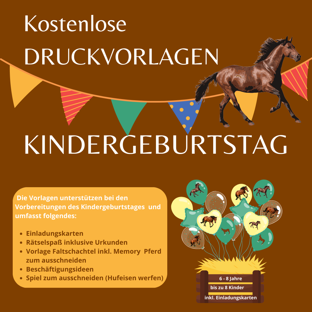 Mit unseren kostenlosen Vorlagen im DIN A4 Format wird der Kindergeburtstag zum Thema Pferd zu einem unvergesslichen Erlebnis. Die liebevoll gestalteten Einladungskarten, die kreativen Faltschachteln, die unterhaltsamen Memoryspiele, die Ausmalbilder, der Rätselspaß und die actionreichen Spiele bieten eine rundum gelungene Mischung für einen Tag voller Spaß und Freude. Laden Sie die Vorlagen jetzt herunter und starten Sie gemeinsam mit den kleinen Gästen in eine magische Welt voller Pferdeabenteuer!